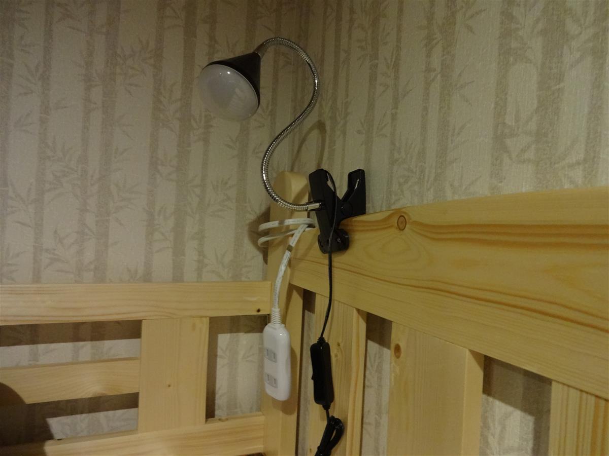 枕元にはライトとコンセントがございます。下段に引き出しタイプのベッドがございます。ご家族やお友達にお勧めです。
